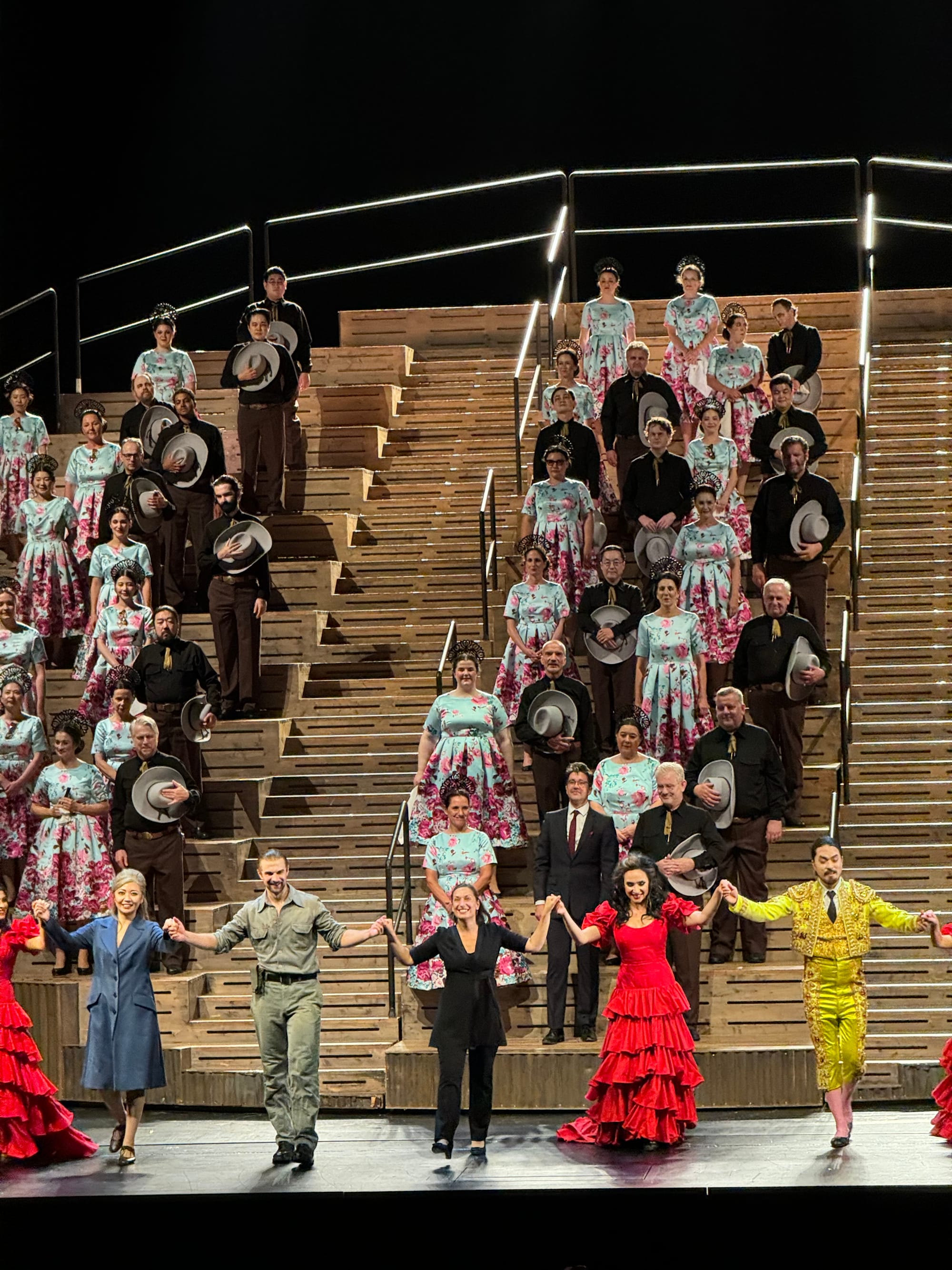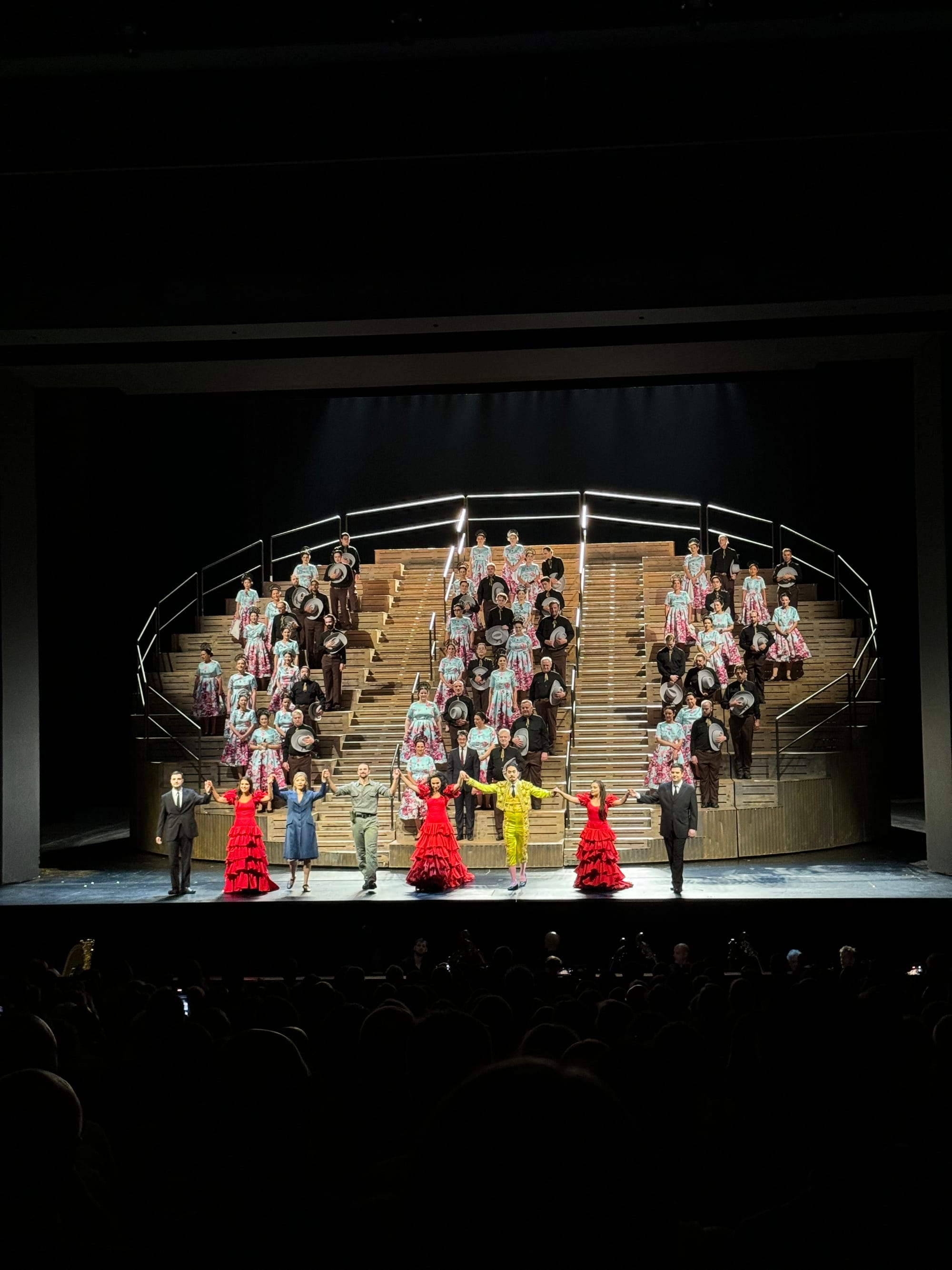 This production leans heavily into these tropes and paints an uncomfortable, but all too realistic picture of patriarchal sexuality and misogynist violence with rapey undertones that dominate throughout the piece. Micaëla is immediately in danger of being abused by a platoon of horny soldiers, Escamillo gifts Carmen massive testicles of a slain bull, guns become phallic symbolism, and finally, the most famous femicide in opera occurs—particularly violent in this production, with José ripping out Carmen’s heart (which I believe is displayed in a gory close-up on the curtain. Or not? Let me know in the poll).