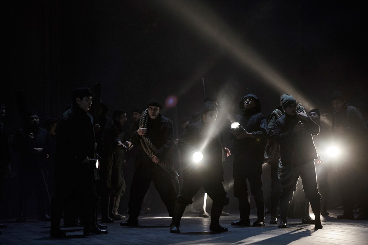 Christian Spuck’s production creates a dark, dreamlike atmosphere from the outset, something which is familiar from some of his Staatsballett productions. Mist clouds the stage, actual raindrops fall into puddles, and the steady dripping is often audible in quieter musical moments. The emotional core of the production is Erik, whose torment is foreshadowed in the overture when he smashes a wooden ship against the wall—a sign of the dread he will come to feel toward the Dutchman and his ghostly crew.