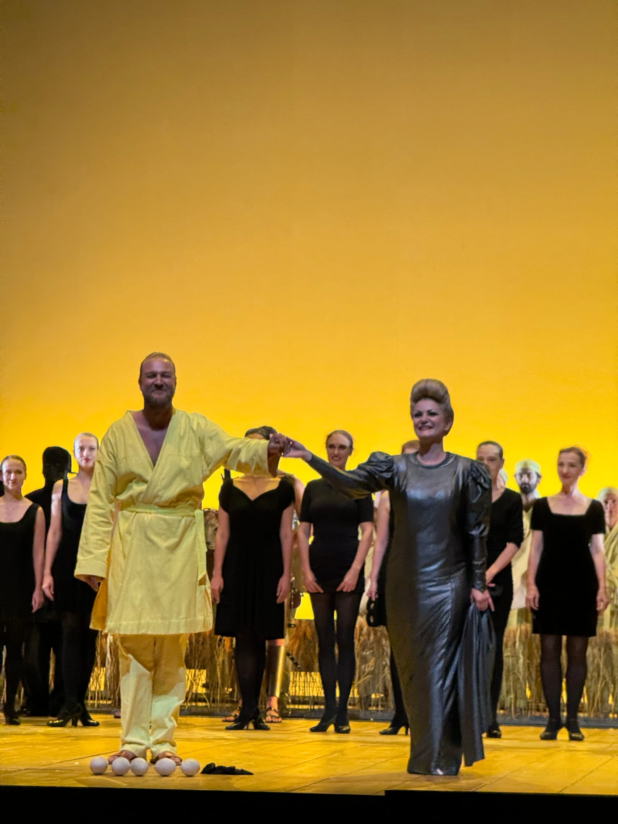 With this complexity in characters, motivations, and conventions, it is almost paradoxical that the Zauberflöte appears to offer such unambiguous moral guidelines of good and evil, consistently praising innocence, wisdom, fortitude, and honesty as virtuous—and painting a clear picture about who adheres to these values. Spoiler: with the exception of Pamina (who works her butt off for this recognition), only men possess these qualities. And it is ultimately Sarastro who grants approval while claiming moral superiority. Ironically, the production introduces him as “primus inter pares” emerging from field work, while his subjects praise him as their “idol”. And because the German “Abgott” has an almost divine Sumerian connotation, I’m getting Maoist agrarian cult vibes from Sarastro and his (oppressed?) followers.