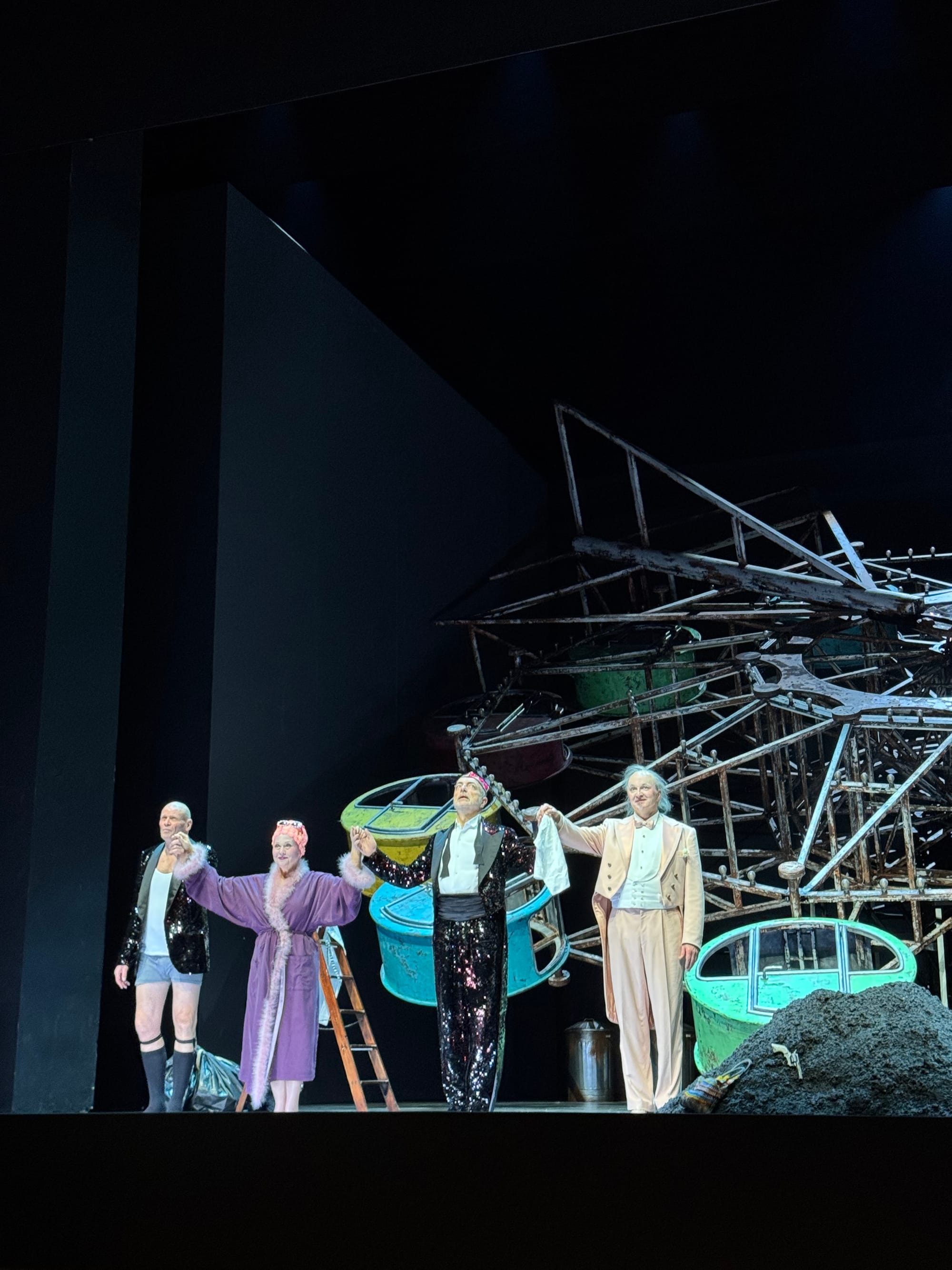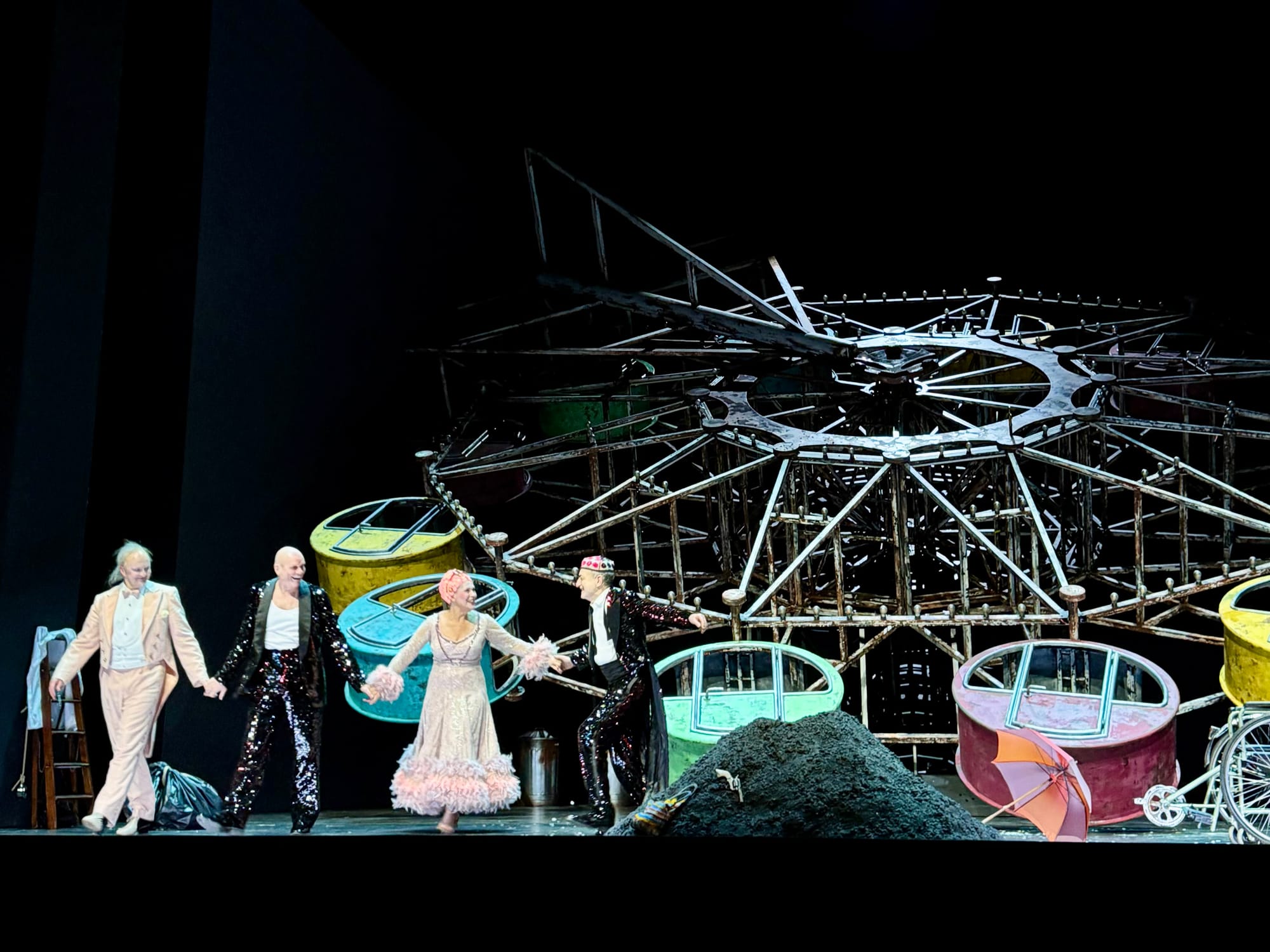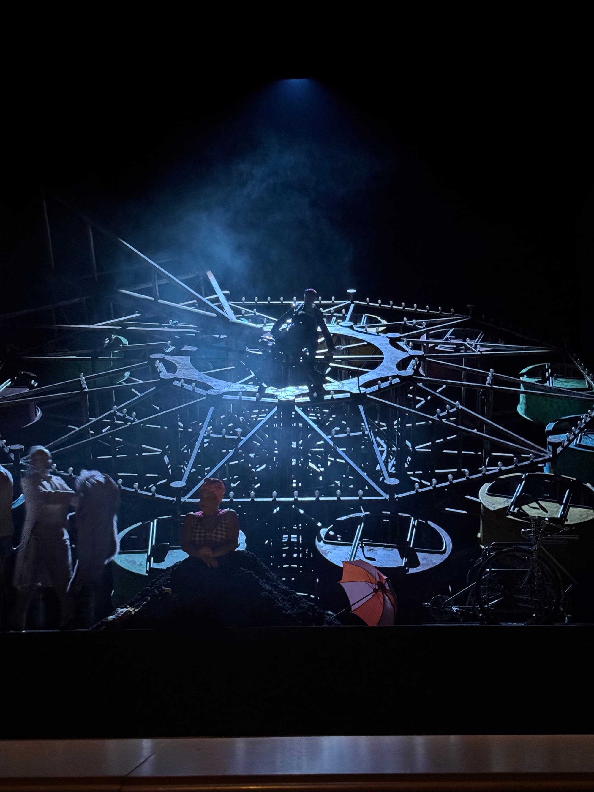 This absurd and desolate world is brought to life in a visually striking staging: film projections mirror the onstage acting, curtain cutouts magnify key moments, layered sets add depth, and an overall arthouse vibe emphasizes the sparse, haunting score. In the final climax, a ferris wheel toppled over on its tide starts eerily turning, with carnival lights blinking ominously (in fact, I spent the whole last part wondering and “doing the math” if it might be able to turn).