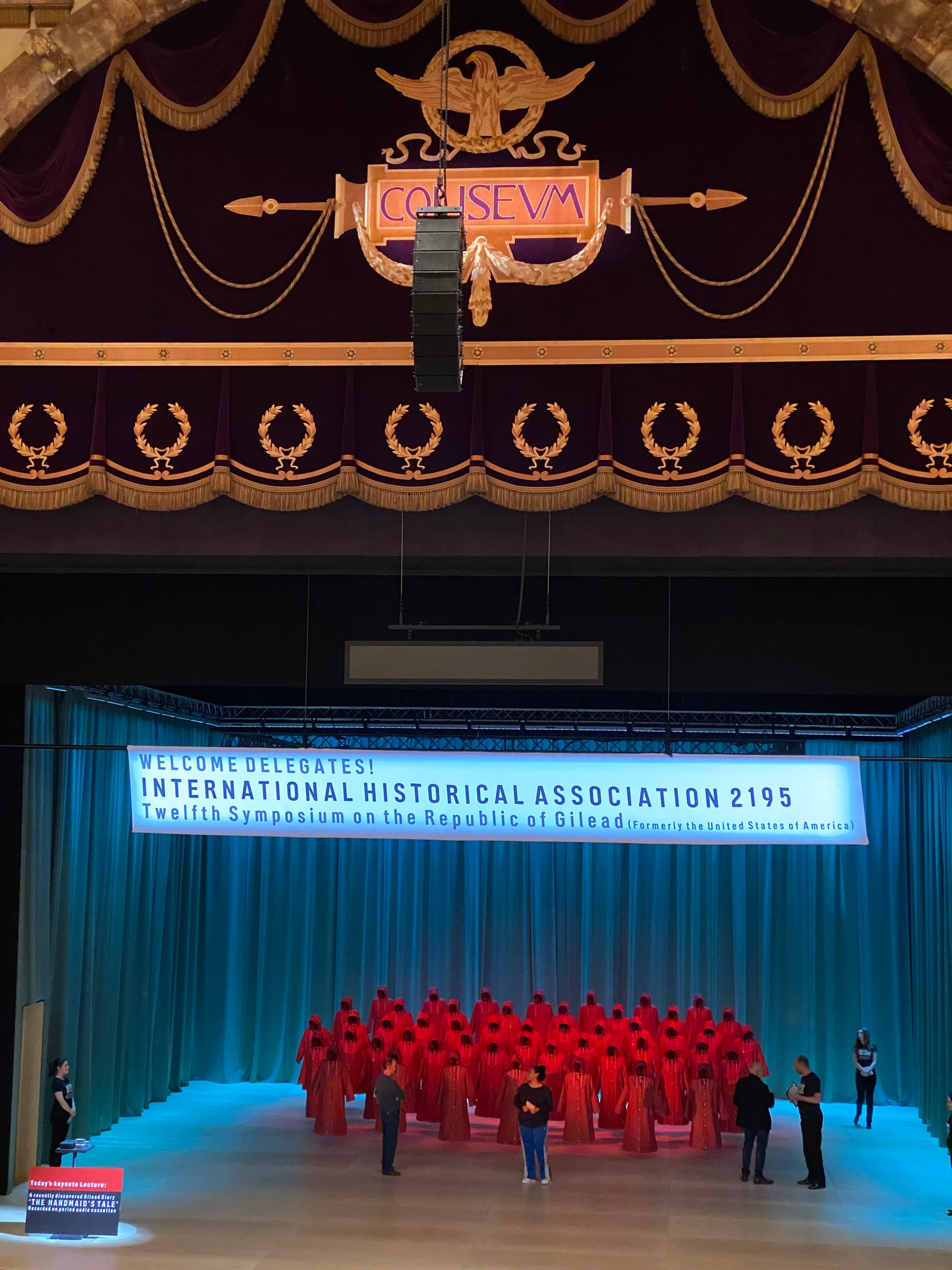 Readers of the source text will recognize that in the opera version, we too jump between three different points in time. The opera begins in the year 2195–a time after which even Gilead has fallen—at a convention of the „International Historical Association“, where the recently discovered audio tapes by handmaid Offred are the topic of much discussion. The contents of the audio tapes are then acted out on stage as the main plot of the opera, with flashbacks to a pre-Gilead time shown as black and white projections.