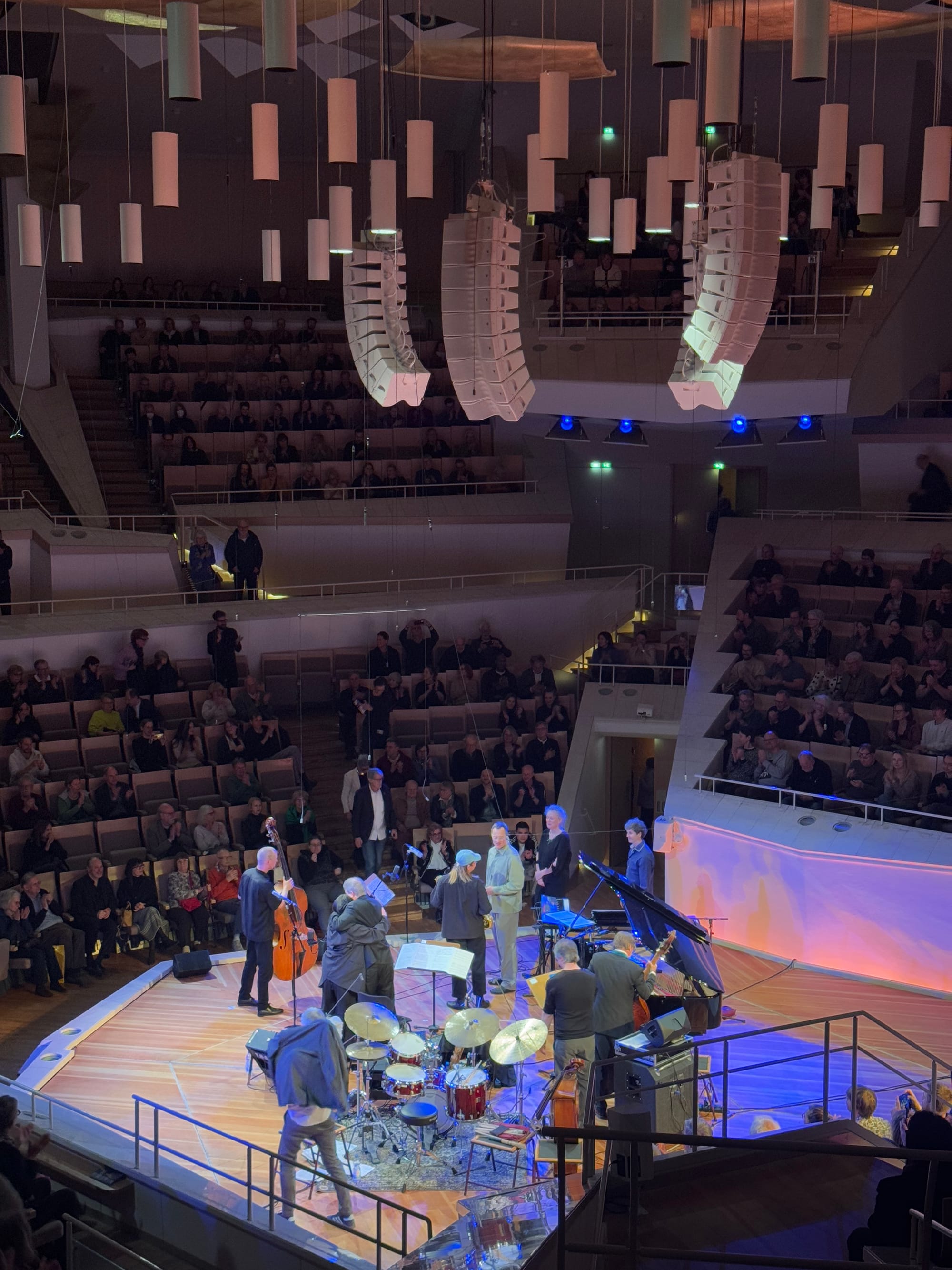 The evening’s program, featuring three Berlin-based ensembles, reflected the breadth of the city’s jazz scene. Since my knowledge of jazz is incredibly limited, I’m paraphrasing from the website of the Berlin Phil as well as the program’s verbal introduction to illustrate the band ensembles: Speak Low, led by singer Lucia Cadotsch, offered an unpretentious and effortlessly smooth sound. The Julia Hülsmann Quartet showcased an intricate and nuanced style, embodying both the German jazz tradition and the impact of women in the genre. Finally, Kurt Rosenwinkel’s ensemble brought an international perspective, with Rosenwinkel—one of the most influential jazz guitarists of his generation—bridging the Berlin scene with the wider world of jazz. Each group had its own distinct instrumentation, yet a common thread remained: the bass as a grounding force throughout the night, with voice, saxophone, and piano weaving their own textures into the mix.