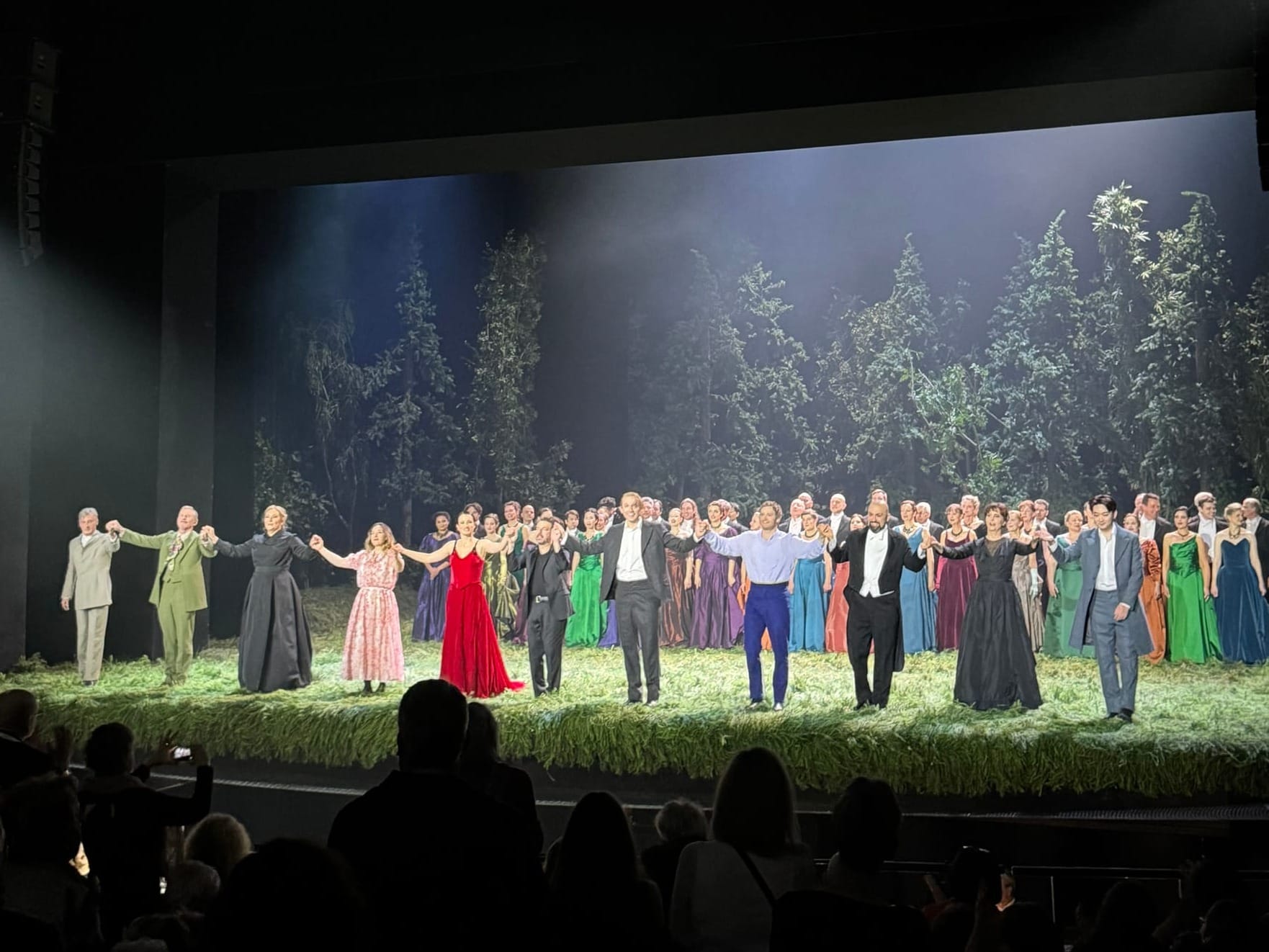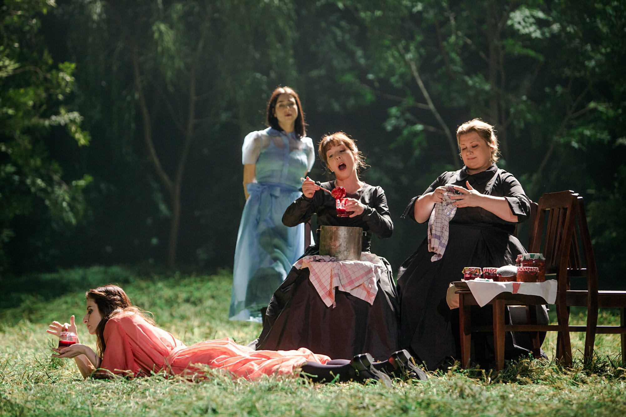 What unfolds from there is one of the most luscious stagings I've encountered. The clearing is not backdrop; it breathes! Villagers emerge from the back, stepping out of the tree line as if from somewhere else entirely. The Act I picnic—food, badminton, a rotating stage, a cheerful folk song, the whole nine yards—is the kind of scene that reminds you what opera can do when it commits to filling a stage with actual life.