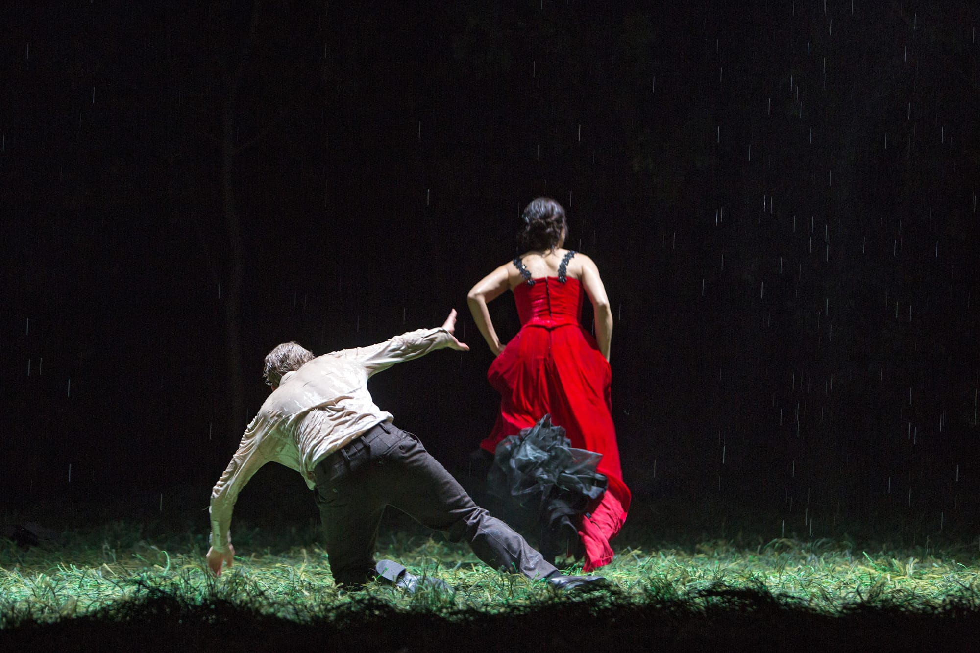 In Pushkin’s original version, Tatiana ultimately rejects Onegin despite admitting that she still loves him. This production adds one crucial twist: they kiss. For a moment, the temptation becomes real. The rain begins to fall as they stand once again in the forest clearing—the emotional birthplace of their story. Then Tatiana breaks away and runs into the woods, leaving Onegin alone to confront the wreckage of his own choices.