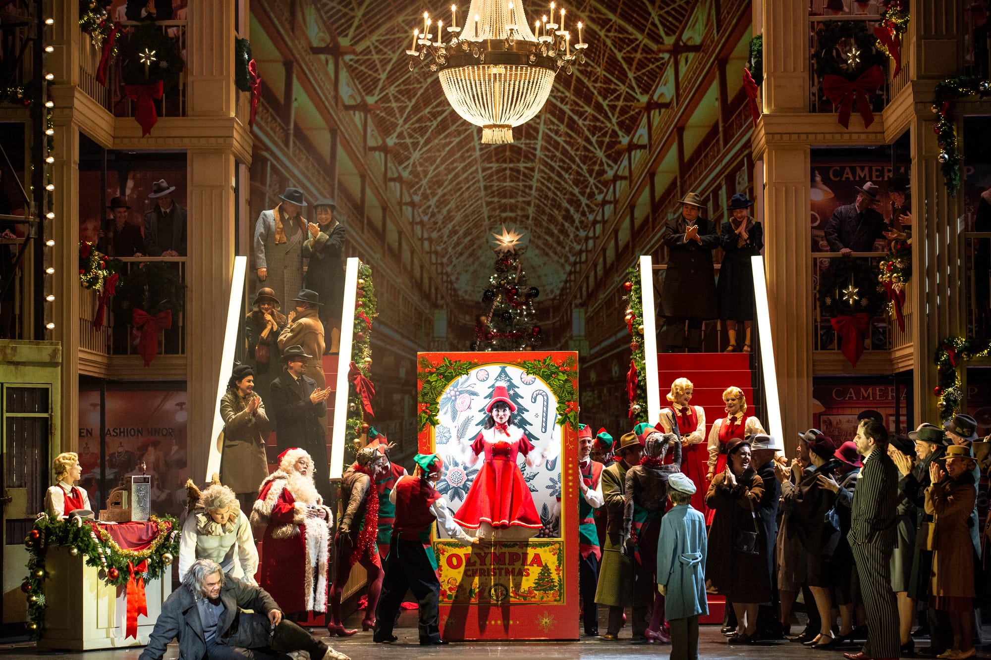 Before getting to the women themselves, it's worth pausing on what Steier has built around them—because the production's visual ambition is, by any measure, considerable. This is not a staging that establishes a single aesthetic world and inhabits it for the evening; it's one that builds an entirely new one for each act, the purgatory bar ascending from below to anchor the piece's framing, the department store assembling itself for Olympia, each subsequent act arriving as its own dedicated visual proposition. The cumulative effect is of a production that has done an unusual amount of work—structural, spatial, imaginative—and it shows, in the best sense.