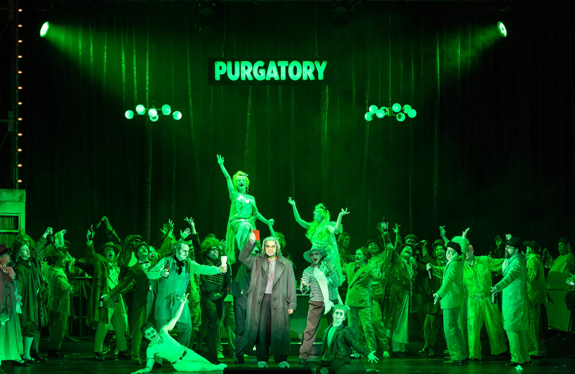 It's a brave structural gamble, killing your protagonist before the first aria, and Steier earns it by committing fully to what it implies: the opera reframed not as romantic tragedy but as purgatorial guided tour, a Dickensian visitation-of-the-past through which Hoffmann—escorted by angel and devil in the manner of a man who took the Scrooge extended cut—is walked back through the women in his life, each a distinct and differently shaped disaster. Purgatory itself is rendered in absinthe greens and 1920s art deco languor, populated by dead artists (Mozart, Elvis, the usual suspects of doomed genius) who apparently also failed to resolve their contradictions in time. It's a little on the nose, but the point lands: being both brilliant and a mess doesn't get you a pass, it just gets you company.