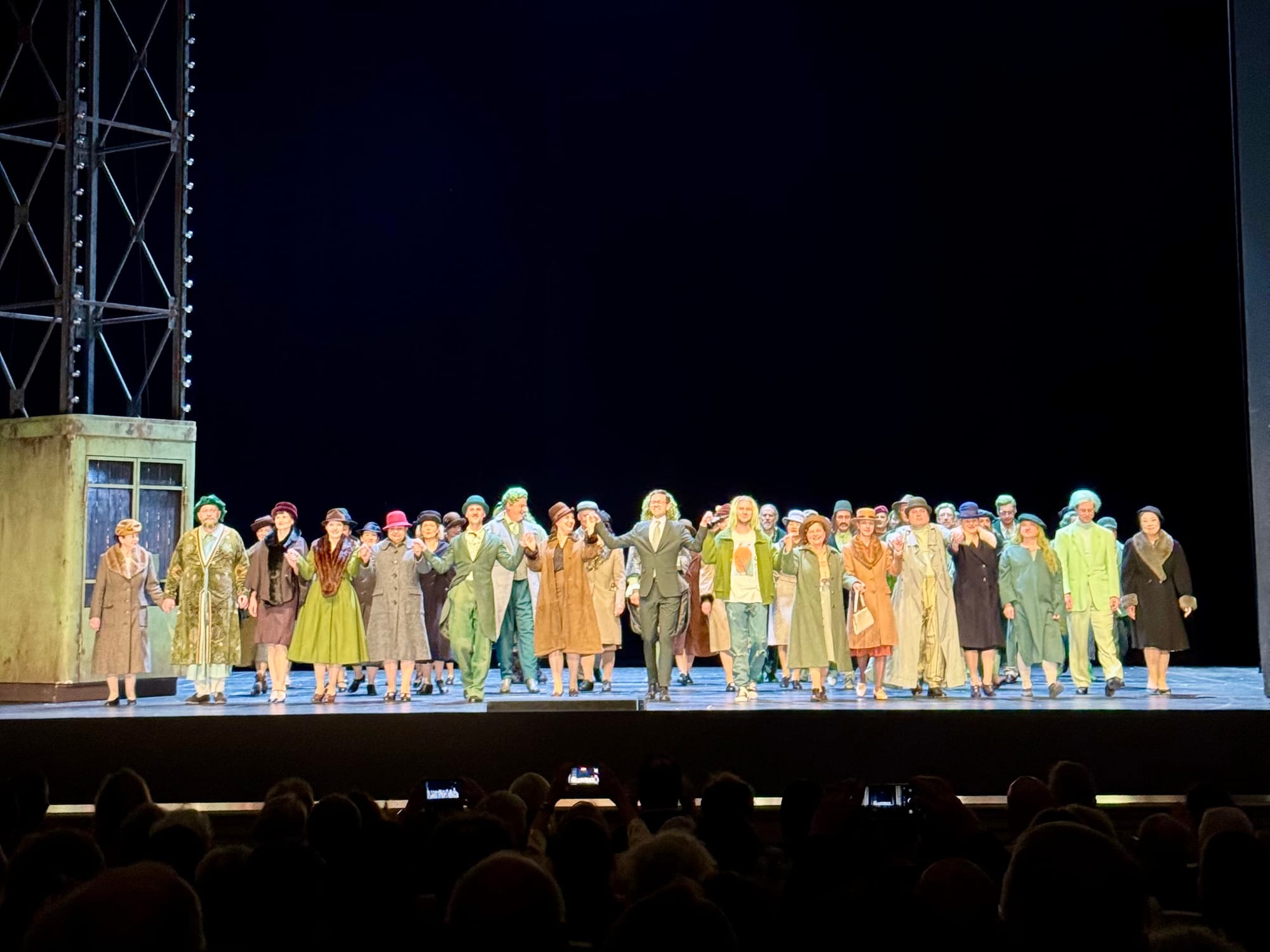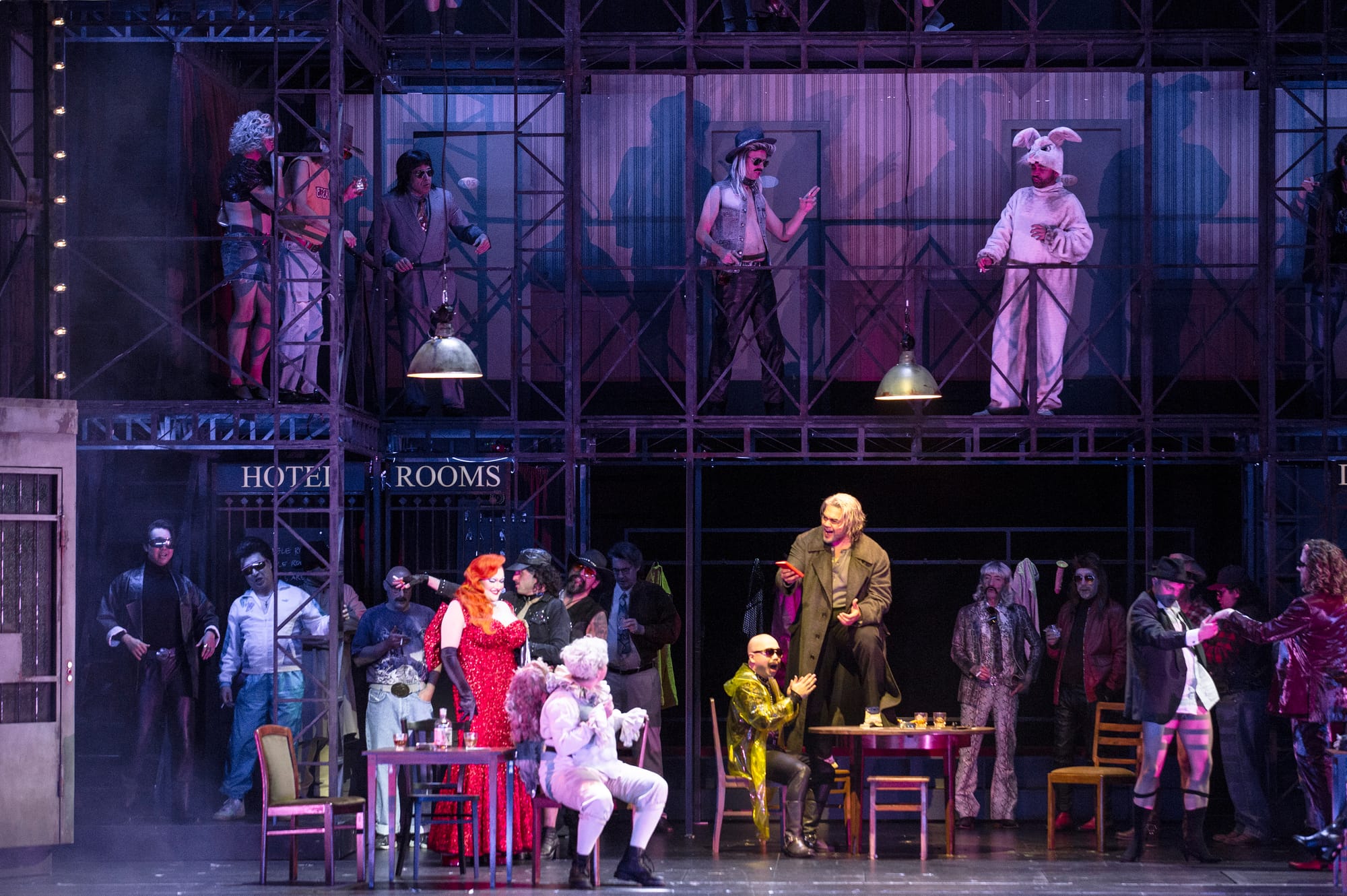 What follows is the evening's final surprise: Hoffmann kills Giulietta, but accidentally. A misstep rather than a crime, and the production softens it accordingly. the elevator—present since the opening, its purpose never in doubt—ascends, the Pearly Gates open, and Hoffmann disappears upward—absolved, redeemed, and on his way. It is, by this point, a pattern: the production has been quietly softening Hoffmann's ledger all evening, and the question of whether that's generosity or excuse is exactly what the final act inherits.