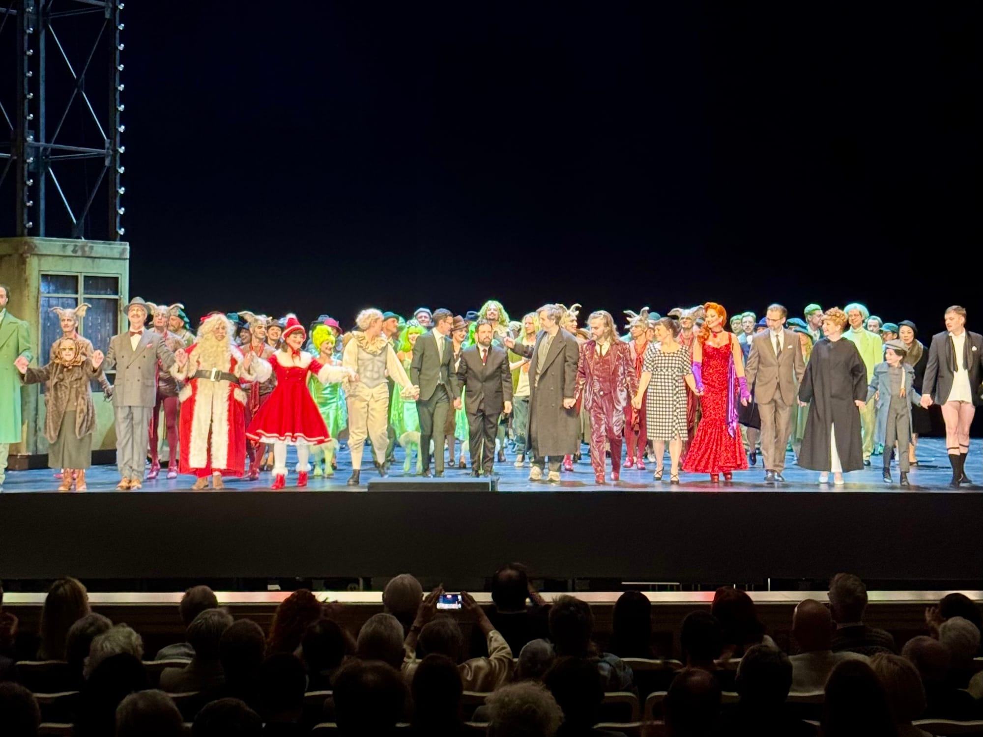 Most of them. Because alongside the high-quality work—and the costumes, which in the majority are beautifully made, the kind of thing you notice as craft—there are a handful of choices that look, by comparison, like afterthoughts. The angel, who is not a minor character but Hoffmann's guide through the entire evening, is saddled with a breastplate, a curly wig, and wings that read as noticeably cheap against everything surrounding them—the visual equivalent of a loose thread on an otherwise immaculate jacket. The waitresses in the purgatory opening, in their neon green outfits, have a similar quality: the materiality feels sloppy in a way the rest of the production doesn't permit itself to be. It's a minor complaint, in the scheme of things, but a real one—and it stings slightly more precisely because the surrounding work is so good.