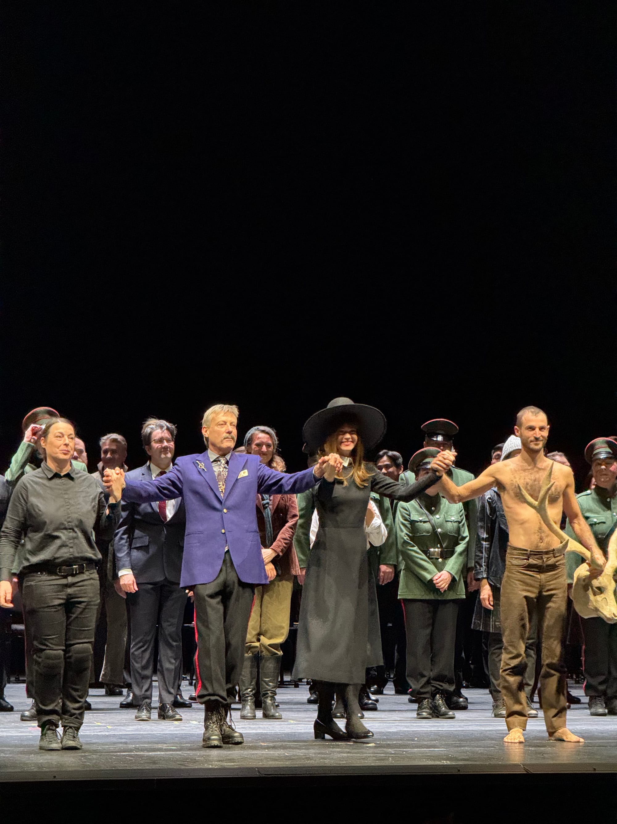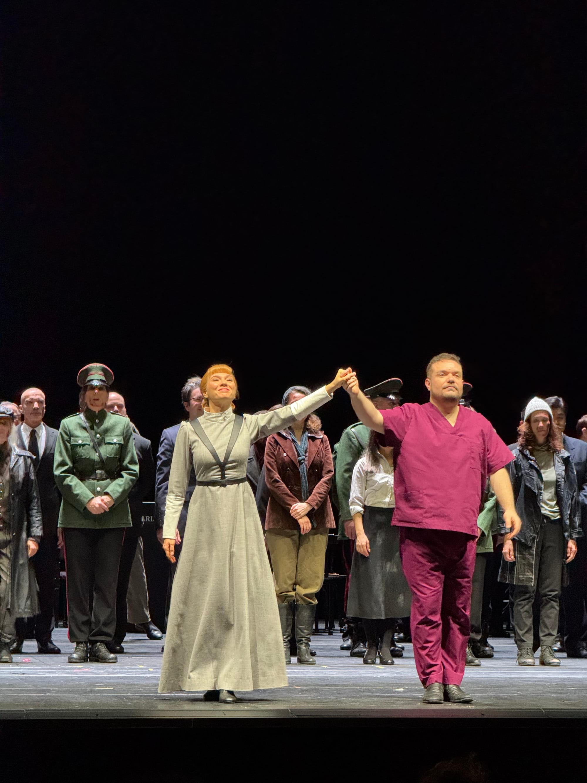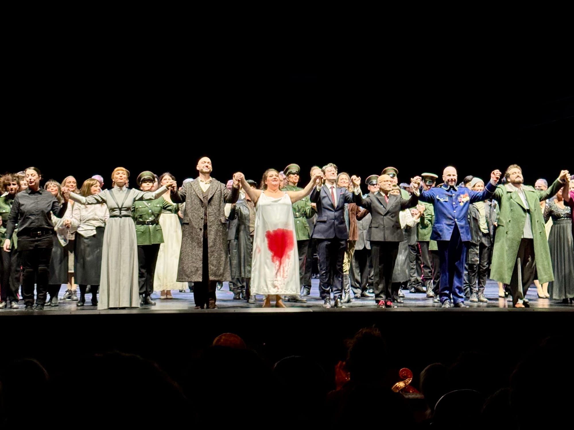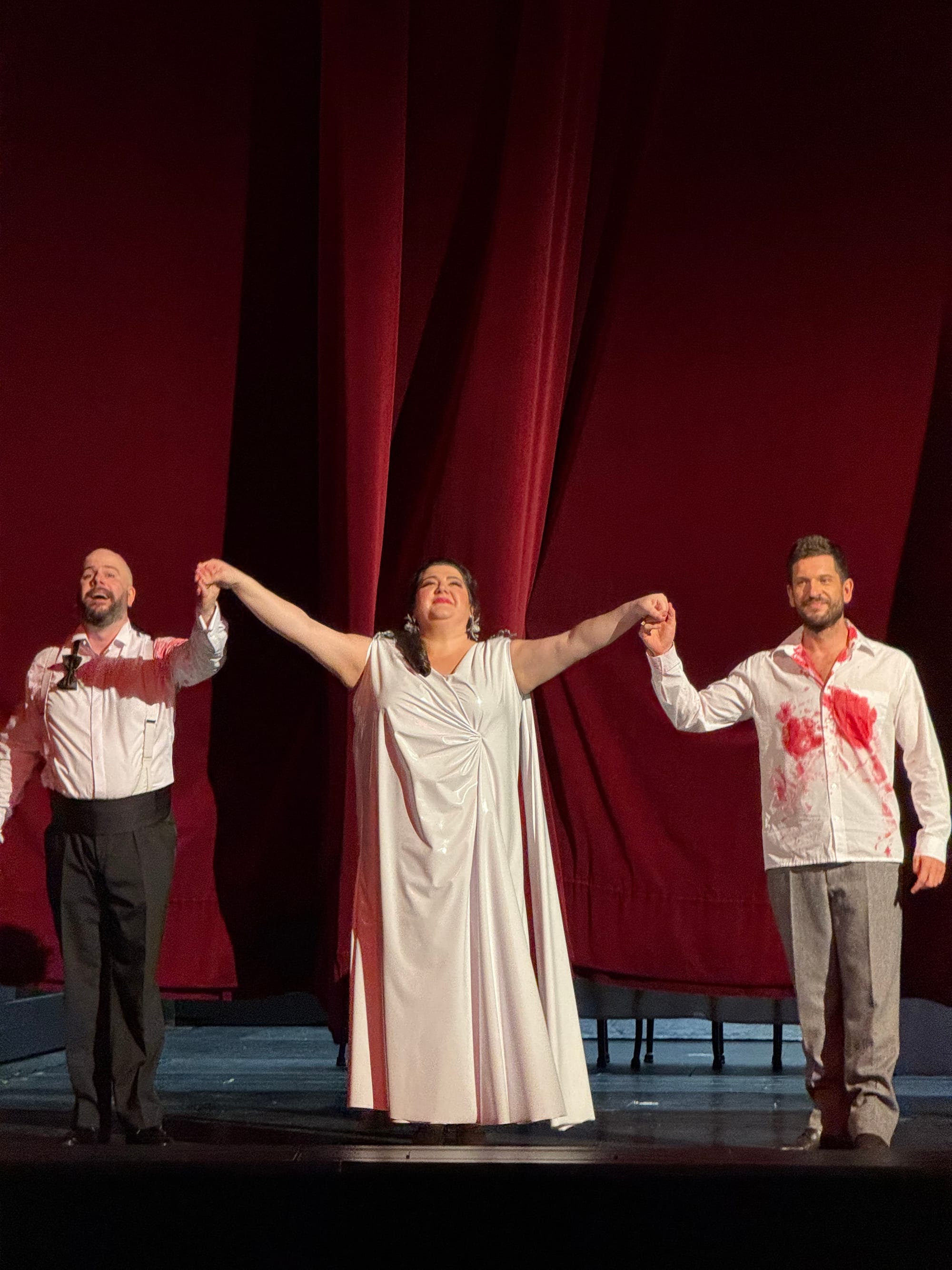 Beyond the political intrigue, this production adds a second layer of conflict absent from the original story: the Macbeths’ intimate struggle with infertility. During an instrumental interlude, they visit a fertility clinic—Sir M provides a sample while Lady M undergoes in vitro treatment. Later, Lady M‘s pregnancy is revealed but tragically ends in miscarriage, culminating in her appearance, à la Lucia, in a blood-stained white gown. It is even implied that this ultimately leads to her descent into madness and suic!de. In this context, Macduff’s line “How can I get revenge when he doesn’t have children? takes on a new poignancy.