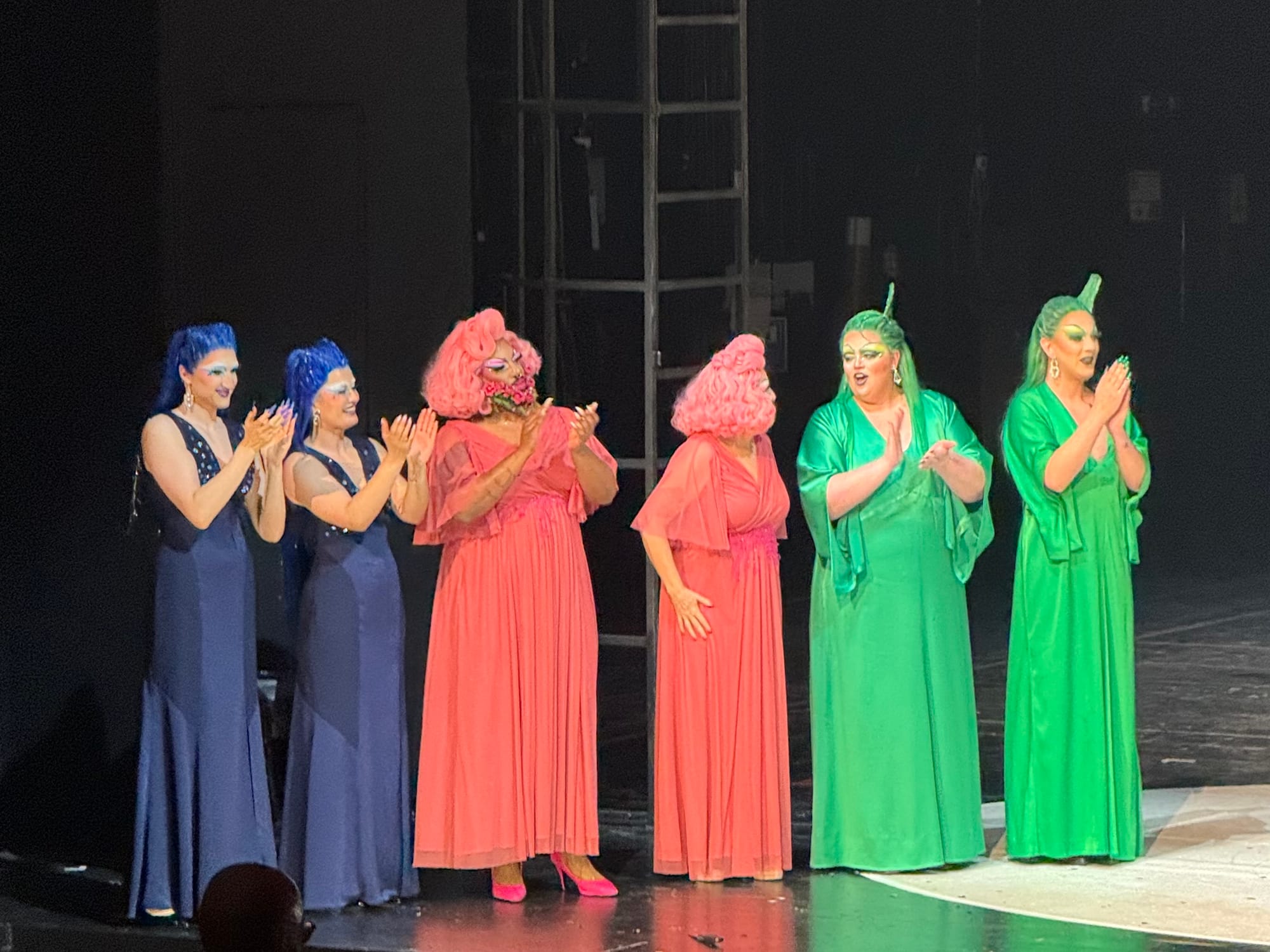 One of the final scenes gives us a wholesome Drag Race Werk Room moment: the queens, now mentors, help the singers into their wigs, apply the finishing touches to their makeup, and prepare them as if for their next drag challenge. What once symbolized rigid gender conformity in Act II is now reclaimed as a joyful affirmation of individuality, artistry, and sisterhood. When the auditorium doors open, revealing an ethereal chorus singing from beyond, the significance of this moment is undeniable—it is sacred, triumphant, and absolute. The nymphs revel in their existence, declaring proudly: “I have a lovely little body,[…] it shines with its charm.”