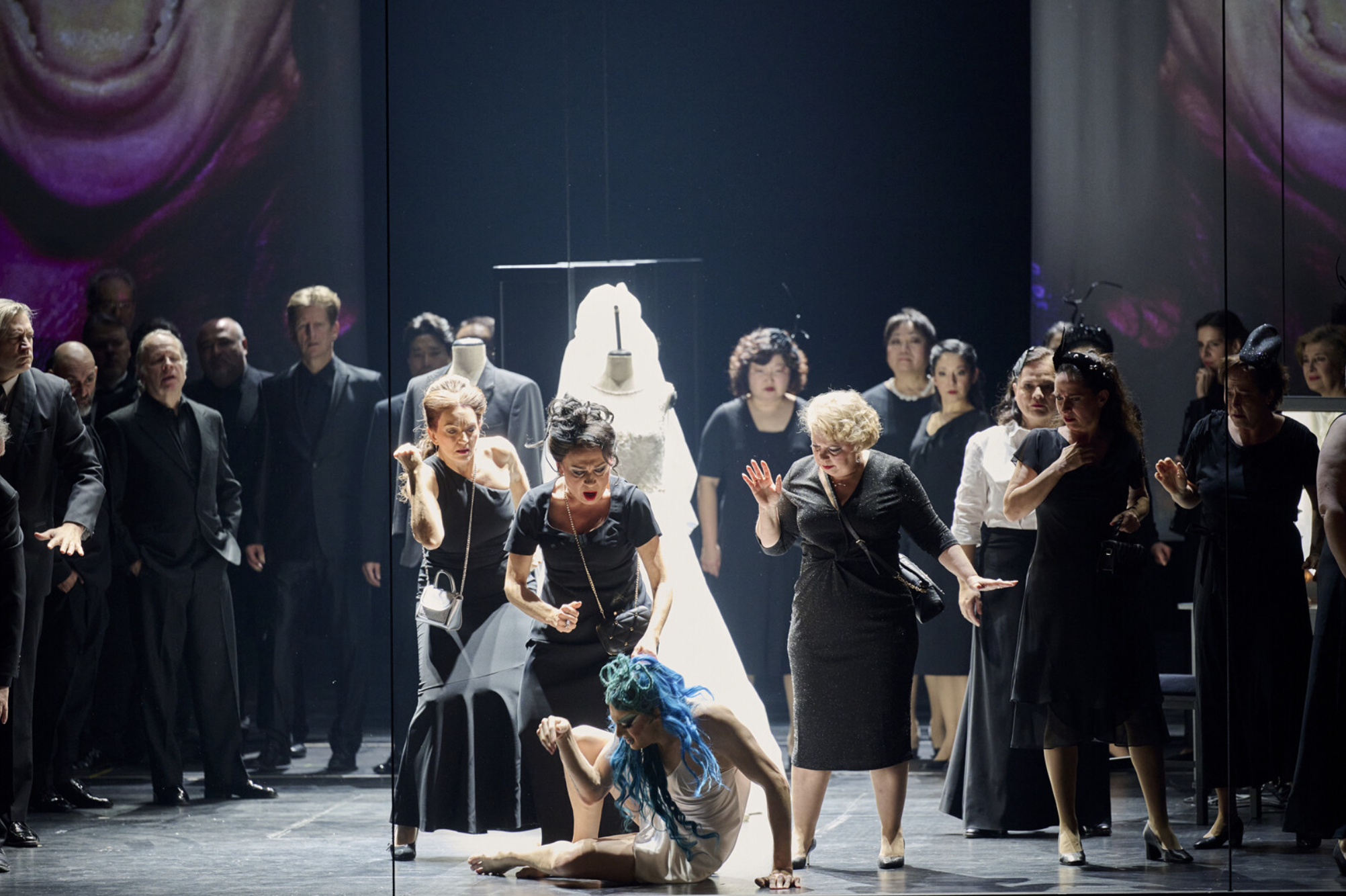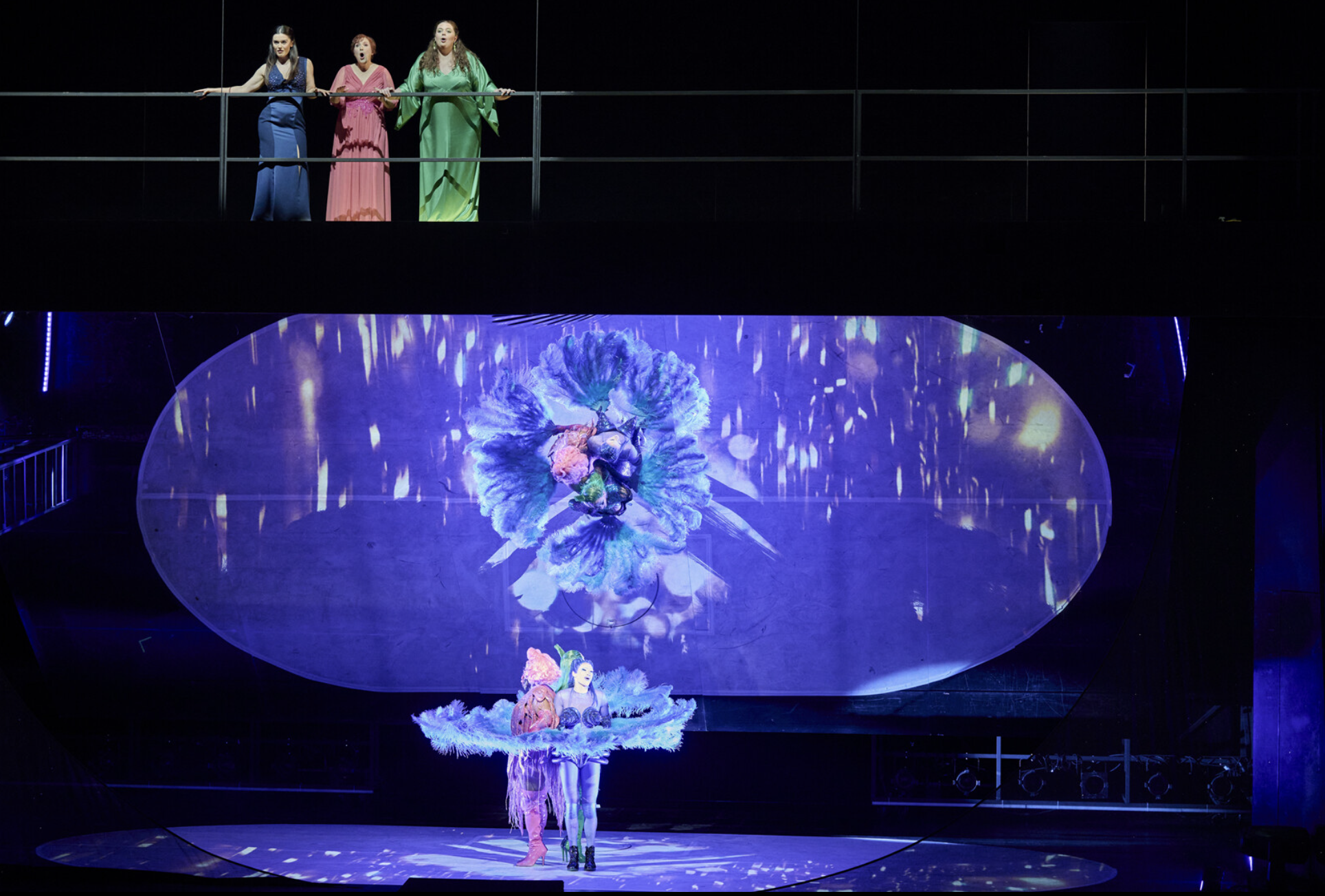 Mirroring itself is a central theme of the opera, reflected both in performance and staging. A massive mirror, spanning the entire length of the stage and fixed at roughly a 45-degree angle, allows the audience to see the drag performance from multiple perspectives—both front-facing and from above. The effect is uncanny: it’s as if we are peering directly into the nymphs’ watery world. The oscillating surface of the mirror further enhances this illusion, evoking the rippling of a pond. Yet this bold staging choice also creates a fragmented visual experience; at times overwhelming, as the audience must navigate three frames of reference—four, if we include the libretto supertitles: 1/ the “human” walkway on which the singers perform, 2/ the stage level where the drag queens bring the story to life, and 3/ in between the two, the mirrored top-down perspective of the second. Conversely, even though the stage mostly consists of black background, it appears filled to the brim with life and color.