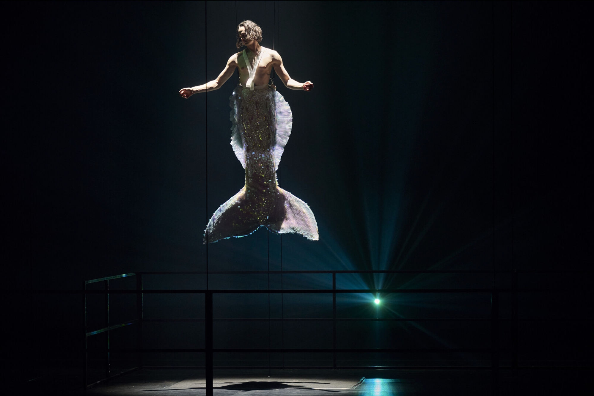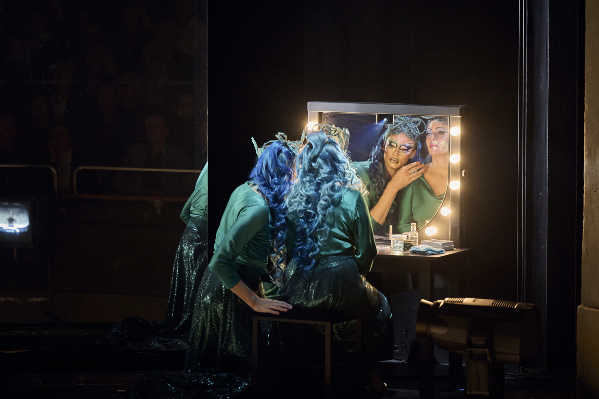 With the final confirmation of the Prince’s betrayal, drag queen Rusalka takes a seat at a dressing table and begins a final act of transformation—one unlike any before. In an incredibly raw display of vulnerability, a camera above the mirror projecting her close-up onto a stage-filling screen, she slowly removes her wig, lashes, makeup, and contacts before finally undressing. With the Prince long dead, she ascends back into the human world. At first, it seems as though, in order to finally belong, she must erase everything that made her a drag queen—that her identity must be sacrificed to fit in. And yet, as the final notes play, the stage transforms once more. Suspended mid-air, Rusalka appears once again in the shimmering mermaid tail she first wore in Act I. The message is clear and deeply moving: her identity is non-negotiable, in or out of drag. This is not an act of surrender—it is a powerful moment of self-actualization.