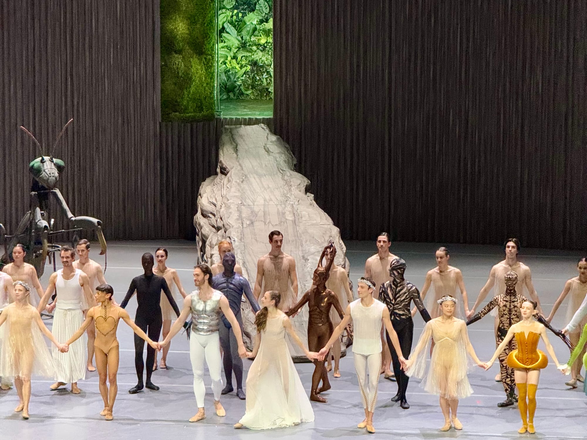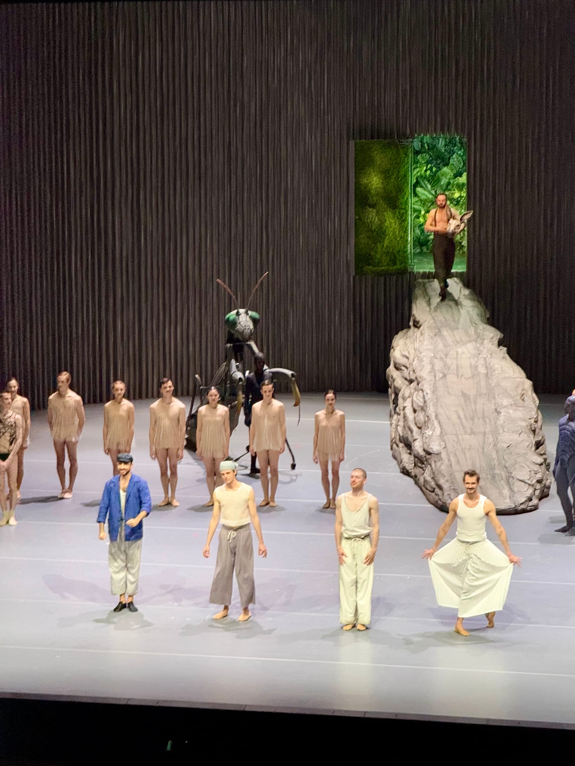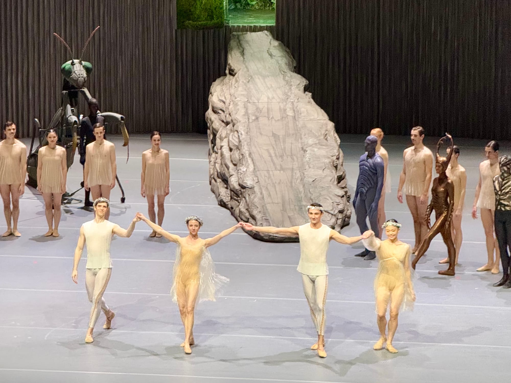 The dream-like nature of the story reaches its visual and magical climax in the scene in which all magic spells are broken and the plot chaos is resolved just in time for a happy end. As Hermia, Helena, Lysander and Demitrius fall asleep, the stage is shrouded in the mist of twilight. The boulder rolls off stage, and in its place another descends like a monolith from the ceiling—visually turning this world by 90 degrees. The four sleeping characters are hoisted up by cables and suspended mid-air, in a position of complete defenselessness and vulnerability. A giant praying mantis walks around them, as if severing the ties between the fairy and human worlds, rendering the former’s magic useless. When they awake, we are returned to “a beach near Athens”, where the wedding(s) are prepared.