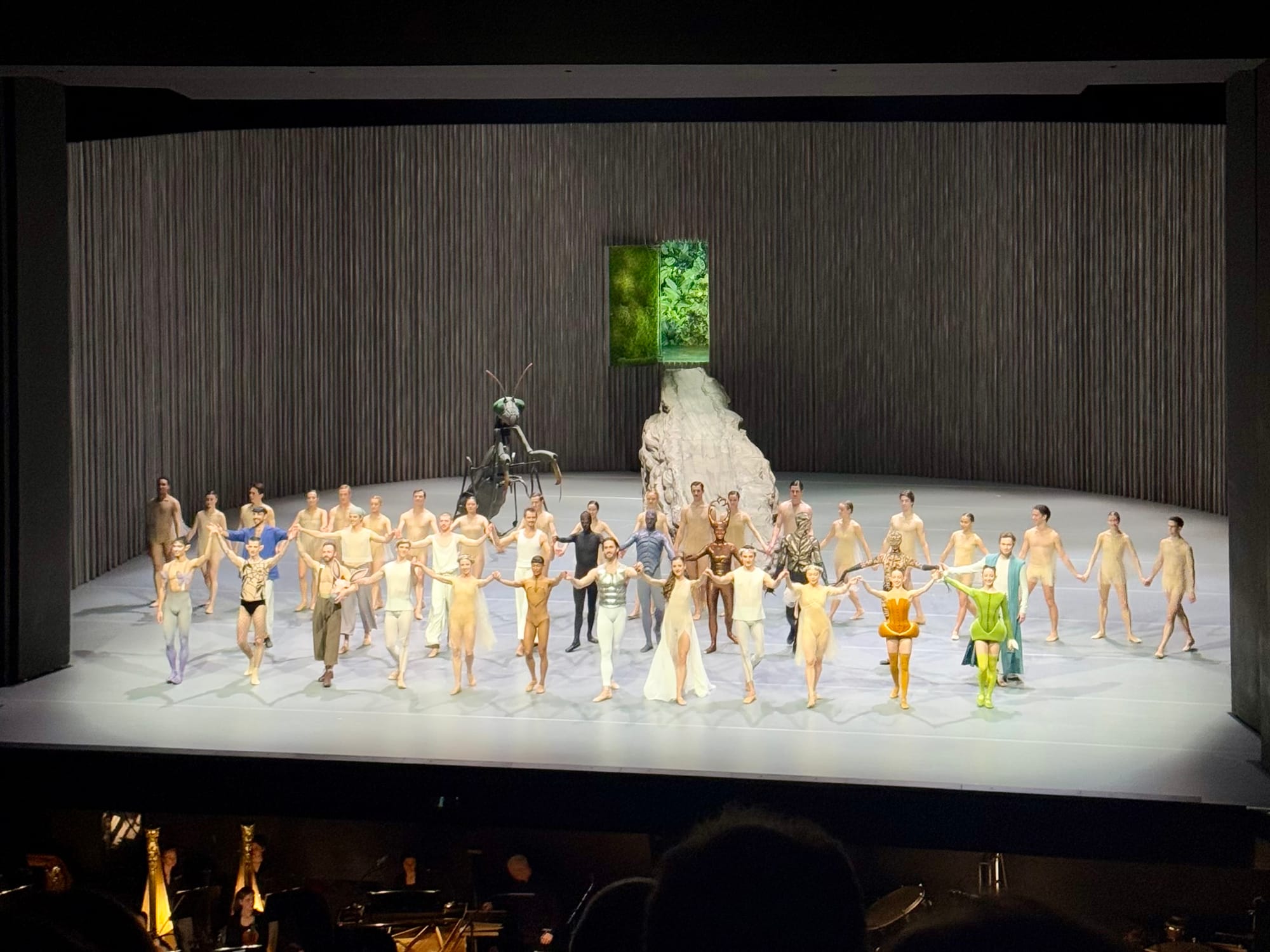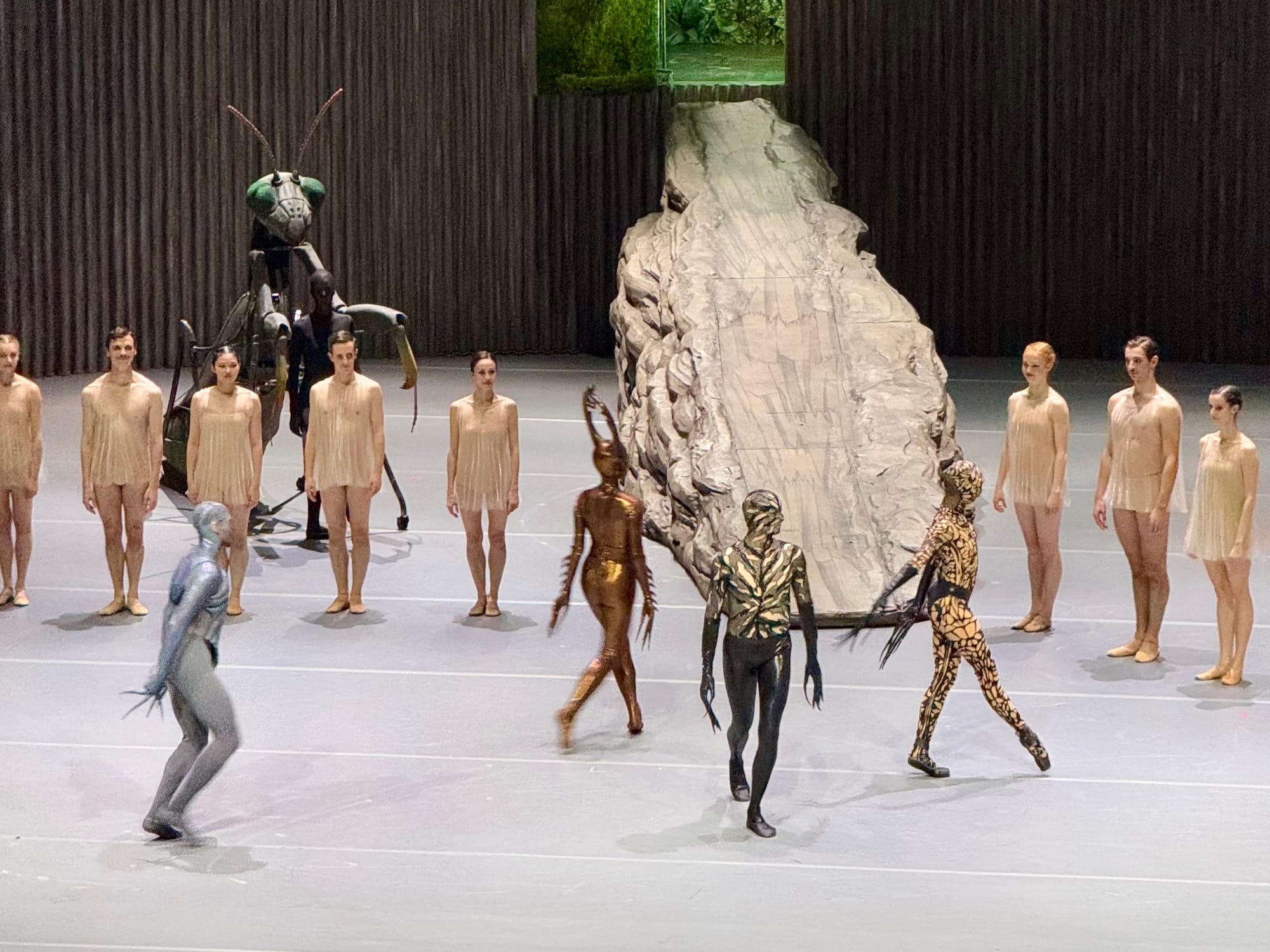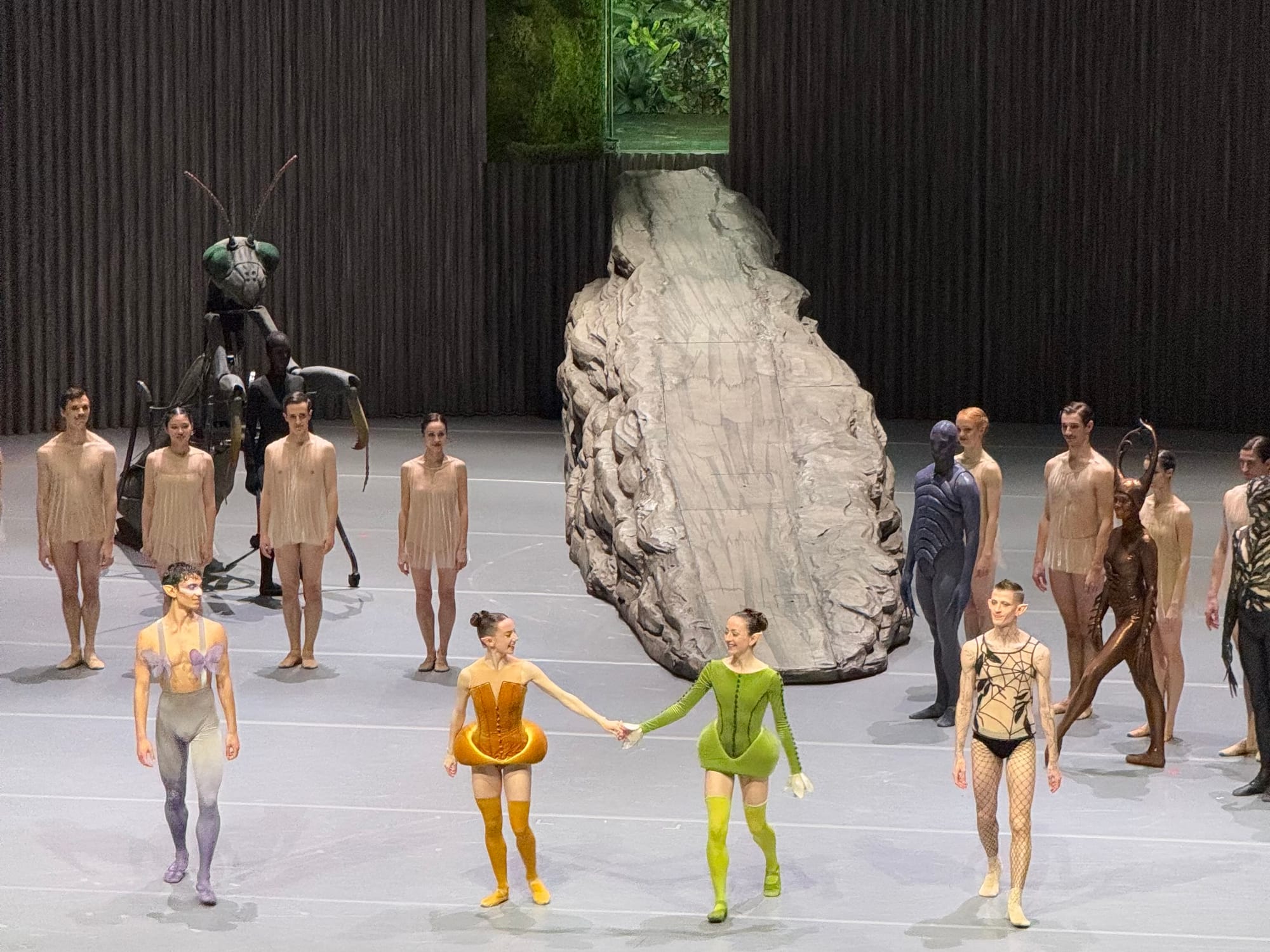 The dream-like nature of the story reaches its visual and magical climax in the scene in which all magic spells are broken and the plot chaos is resolved just in time for a happy end. As Hermia, Helena, Lysander and Demitrius fall asleep, the stage is shrouded in the mist of twilight. The boulder rolls off stage, and in its place another descends like a monolith from the ceiling—visually turning this world by 90 degrees. The four sleeping characters are hoisted up by cables and suspended mid-air, in a position of complete defenselessness and vulnerability. A giant praying mantis walks around them, as if severing the ties between the fairy and human worlds, rendering the former’s magic useless. When they awake, we are returned to “a beach near Athens”, where the wedding(s) are prepared.