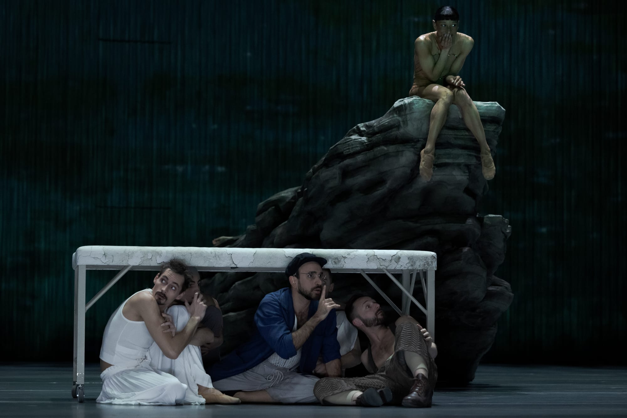 Most notable is the synchronicity in the various pas de deux, which is much stronger when the two characters have closely aligned social standing and potential futures. In cases where social convention prevents two people from finding happiness together, the movements are much less in sync—perhaps a commentary on a society in which social stratification is becoming more extreme and where socioeconomic factors still determine the potential for upward (or downward) mobility. In two instances, props are directly used to block or reduce intimacy between characters: once, a surfboard becomes a wall preventing a kiss between Theseus and Hippolyta; another time, the Mechanics' table turns into a barrier between a moment of physical heat between Titania and Bottom-turned-donkey. Whether this symbolizes social incompatibility or another form of interpersonal tension, we can only speculate.