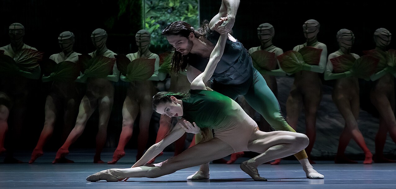 The music for this production of A MIDSUMMER NIGHT'S DREAM was specially created for the Staatsballett Berlin by Slovenian composer Milko Lazar, creating a soundscape that elegantly complements the action on stage. In contrast to the original score by Felix Mendelssohn, the music is not meant to take center stage but instead envelops the choreography and enhances the overall atmosphere. It subtly supports the action, adding depth without overshadowing it. The intention is to create an immersive experience, with moments like the inclusion of Slovenian cicadas evoking the sounds of a summer night and grounding the audience in the natural world that the characters inhabit. The music plays an essential role in shaping the mood, whether in the stark human world or the lush, magical fairy realm.