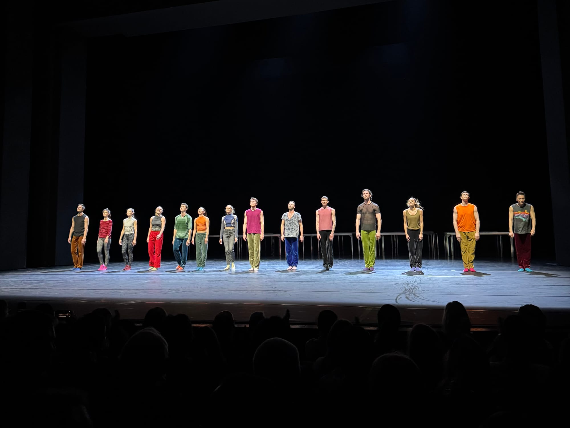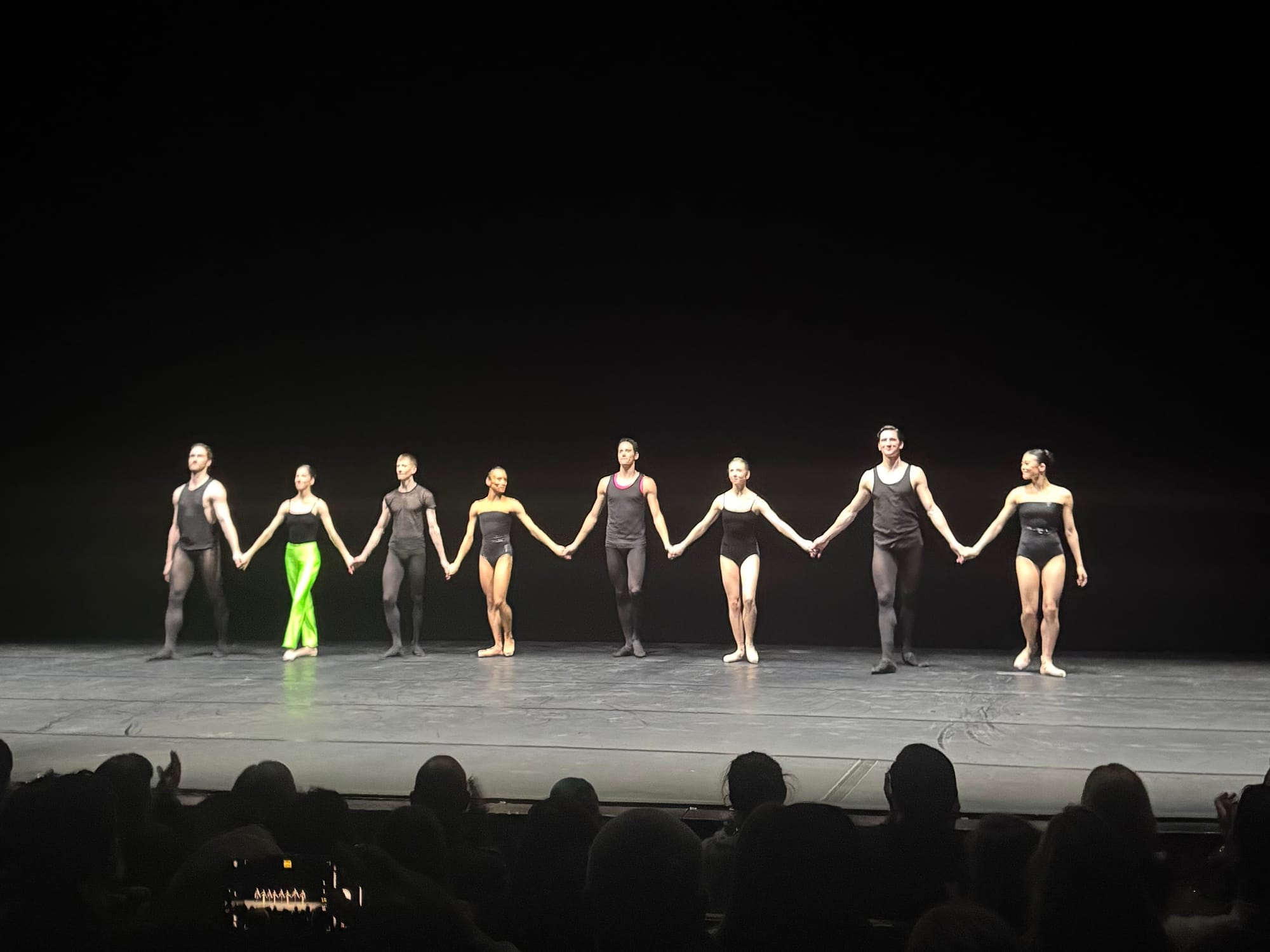 ONE FLAT THING, REPRODUCED was my highlight of the evening. The ensemble starts of the piece by dragging a grid of heavy metal tables from the darkness to the front of the stage, evoking a heavy brass operatic opening. The piece itself is set to something my parents would flatly call noise, while I would (pretentiously) describe it as a hypnotizing arhythmic, atonal series of percussive industrial sounds with modulating pitch, tempo, and beat. The dancer jerkingly move around the tables, using each other’s bodies as support to slide under and jump over/onto them. The movements seem random, but regularly sync up to show there is, in fact, a group choreography. The combination of intense sound, movement and unrelenting tempo make this something I playfully call “brain rot ballet” (as an homage to chronically online scrolling): the brain is so stimulated that thoughts are not allowed to wander beyond what is immediately perceived.